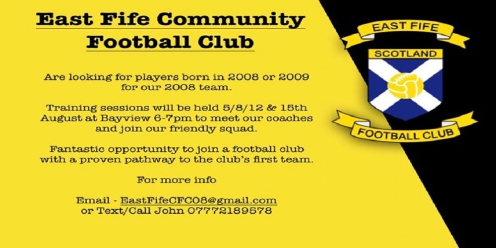 East Fife Community Football club have teams from age 5 to 19 training on various nights for both girls and boys. If your child is looking for a team please drop us an email to enquiries@efcfc.co.uk or contact us through our Facebook page.